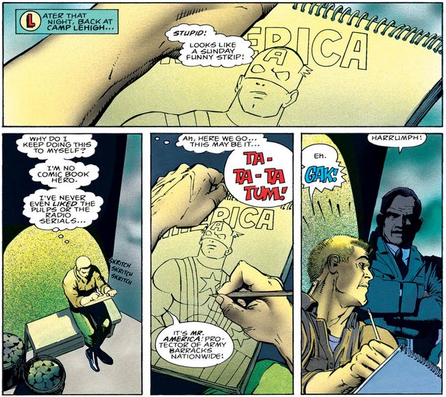 Steve keeps sketching, this time calling his character Mr. America—also the name of a Golden Age DC Comics hero who debuted in Action Comics #1 along with that other fella mentioned above.
