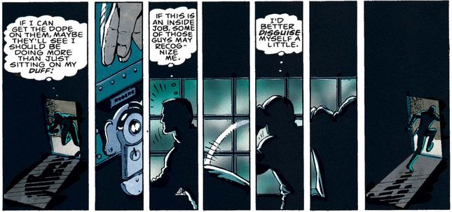 After he hears and then witnesses suspicious behavior, Steve finally sees an excuse to go into action… but as we saw above, he knows to guard his secret identity first.