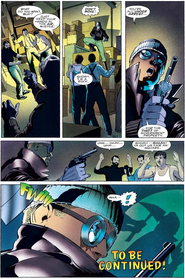 We get a full look at the new Mr. America when he surprises the saboteurs stealing munitions…