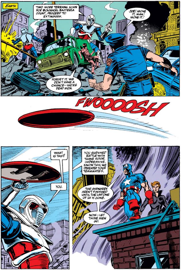 Switching gears to another catastrophe, Alpha Flight #99 is part three of a major storyline involving a character who goes by many names, including Her (related to Him, naturally, the original name of Adam Warlock), which gets a little confusing, especially because comics dialogue is usually printed in all caps! Anyway, she (Her) is fleeing from the Consortium , who are attacking Earth to get her (or Her), and while the more powerful heroes of Alpha Flight and the Avengers engage in battle, Cap takes charge of getting civilians to safety.