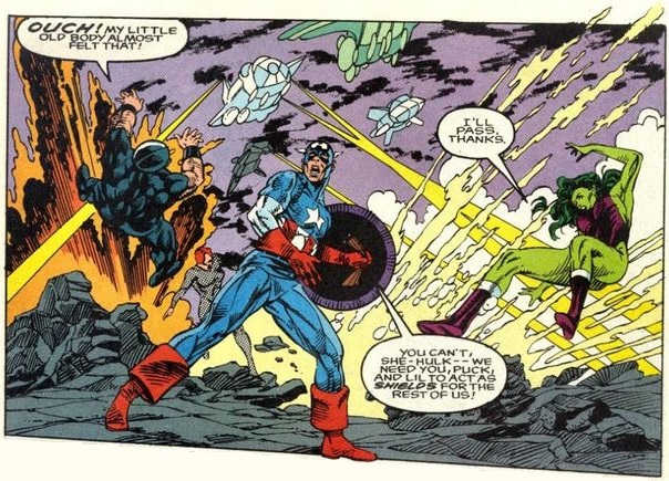 Captain Killjoy scolds She-Hulk for her humorous compliment while Nick is relieved to see so many heroes arrive on the scene.