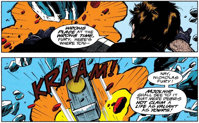 Finally, in Nick Fury Agent of SHIELD #26 we see the aftermath of the Hydra attack from the last issue (referenced in Captain America Annual #10), beginning with Nick about to be squished by a falling helicopter, until “the” hammer falls (and even faster).