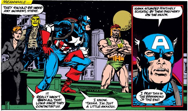 In Avengers #338, the team, which was split for much of the story, reassembles (with the Collector in tow), and Cap is hopeful that new information will be shared that will turn the tide of the battle in their favor.
