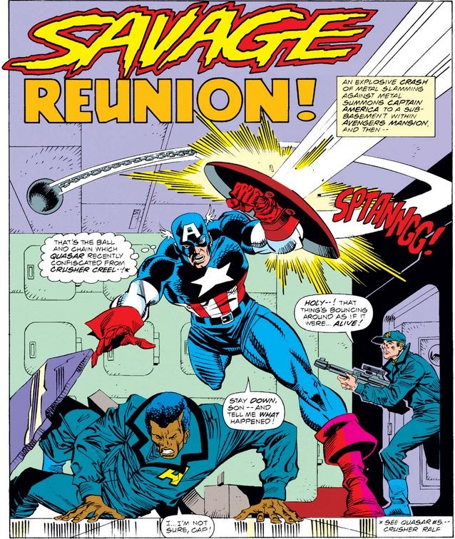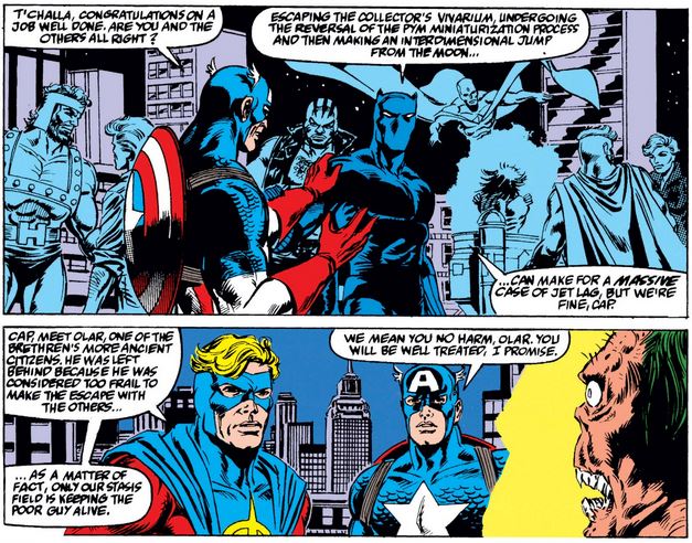 Cap welcomes and congratulates Black Panther and his sub-team, who we have not seen here because… well… Cap wasn’t with them! And when Quasar introduces an elderly member of the Brethren named Olar, Cap promises he’ll be treated well (as a prisoner of war or even better, I’d imagine).