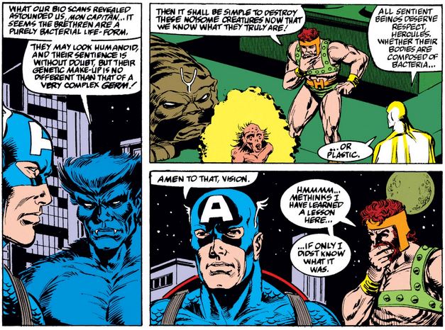 The Beast tells Cap what we learned in the last post about the nature of the Brethren as bacteria created by the Celestials—and when Hercules quickly celebrates what this implies about the ease of destroying them, Vision asserts their worth and dignity as sentient creatures, which Cap quickly backs up. (If only Hercules got the point.)