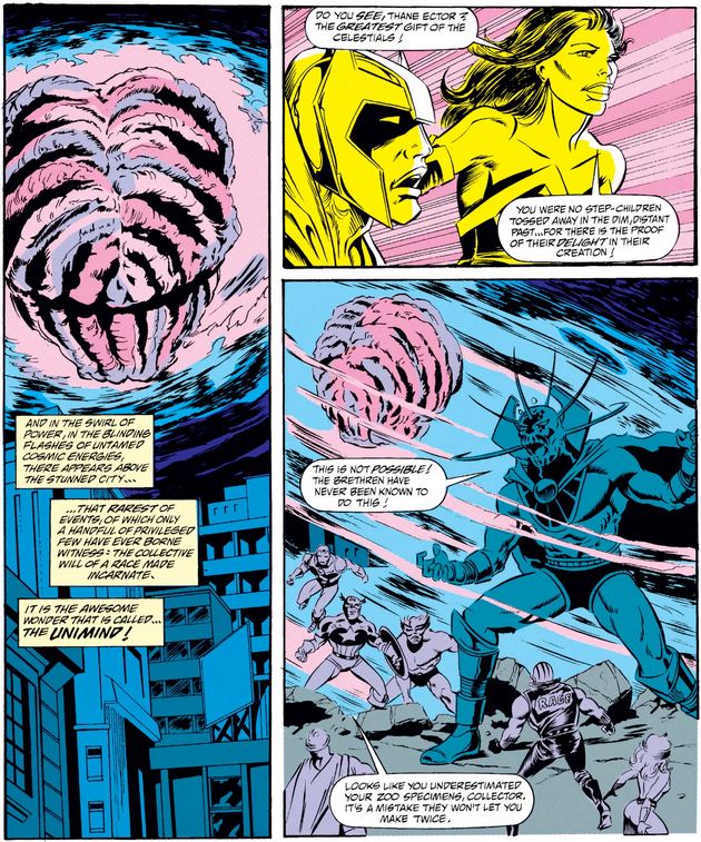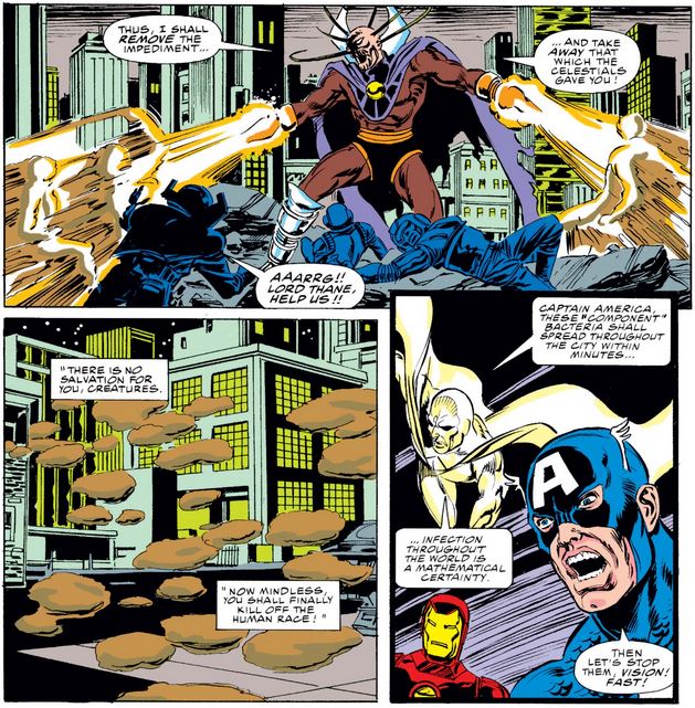 After Vision realizes that the bacteria are still communicating with each other psychically (albeit on a very simple level), similar to the “unimind” of the Eternals (also created by the Celestials), Cap and Sersi try to persuade Thane Ector to use this psychic link to call off his former Brethren and assert their independence from the Collector for the last time.