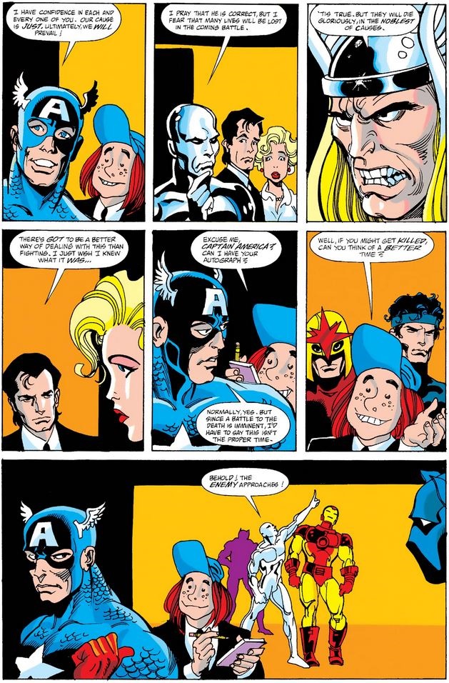 ALSO THESE MONTHS: Infinity Gauntlet #3-4 (September-October 1991), Adventures of Captain America #1 (September 1991), Captain America #391-392 (September 1991), Avengers: Death Trap — The Vault (September 1991), Avengers Annual #20, Namor the Sub-Mariner Annual #1, and West Coast Avengers Annual #6 (September 1991), and Captain America #393 (October 1991)