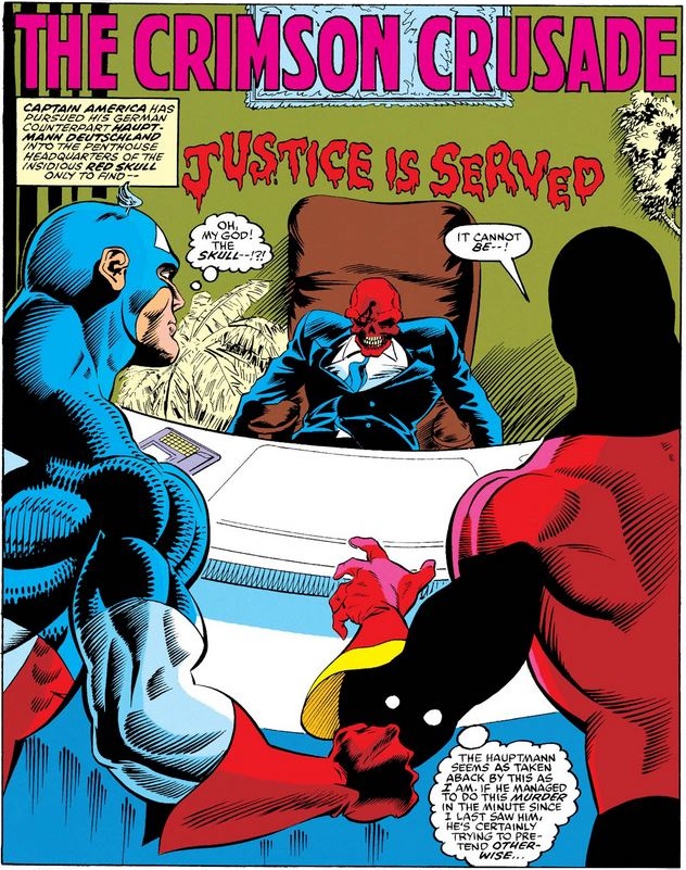 Hauptmann Deutschland similarly suspects Cap is an imposter, after encountering one in the last issue who rescued the Skull from his trial in Berlin, but an imposter likely would not recognize the Scourge’s trademark signature on the wall.