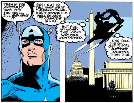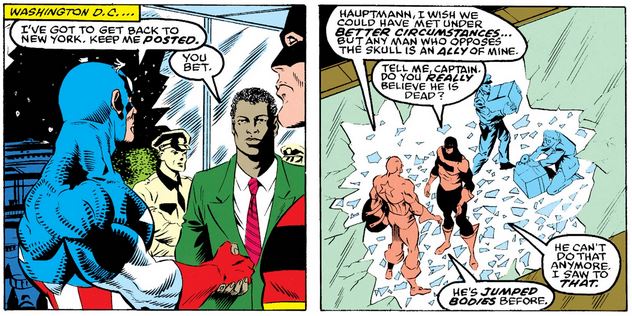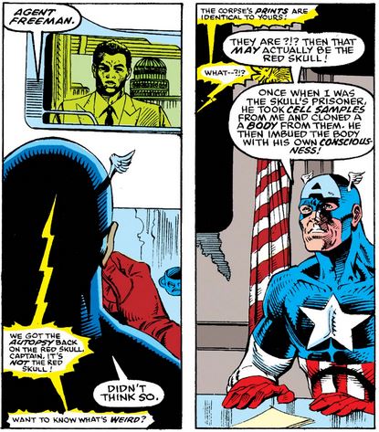 Saved by the bell… or rather Agent Freeman from the FBI, offering news to Cap that is surprisingly (to Freeman) no surprise (to Cap), because the Red Skull is currently in a body cloned from Cap himself (as revealed in issue #350).