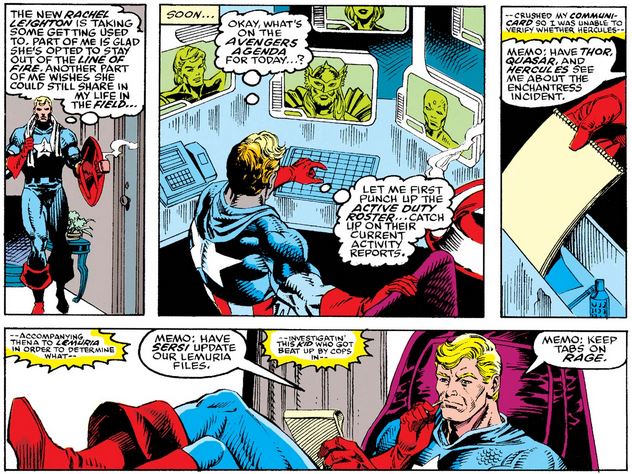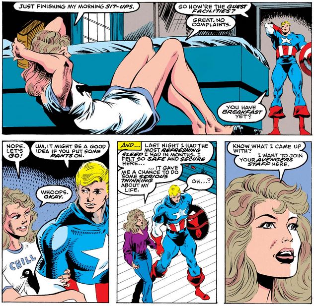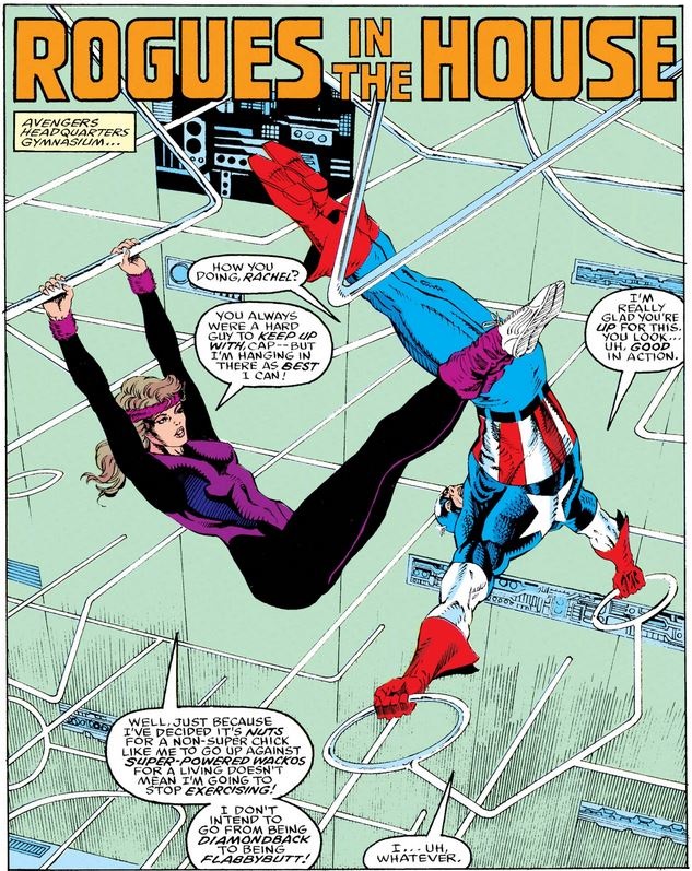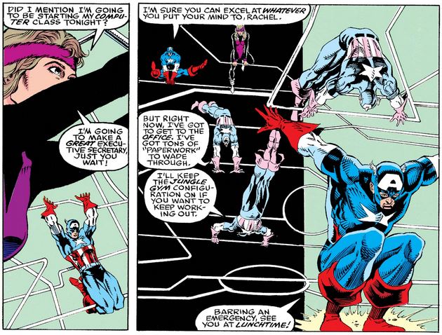 After he returns to Avengers Headquarters, Cap checks in on Rachel (who seems to have skipped leg day to do those sit-ups) and reminds her of the importance of pants (especially if you skip leg day).
