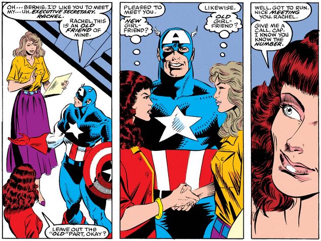 In issue #395, Cap trains with someone who’s allowed to flirt with him, though he finds it very hard to do the same in return (and then fumbles a clear opening to pay her a compliment).