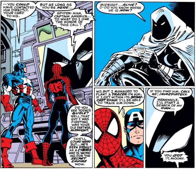 Finally, in Amazing Spider-Man #354, the webhead uses his Avengers status to try to get in touch with Moon Knight…
