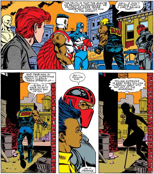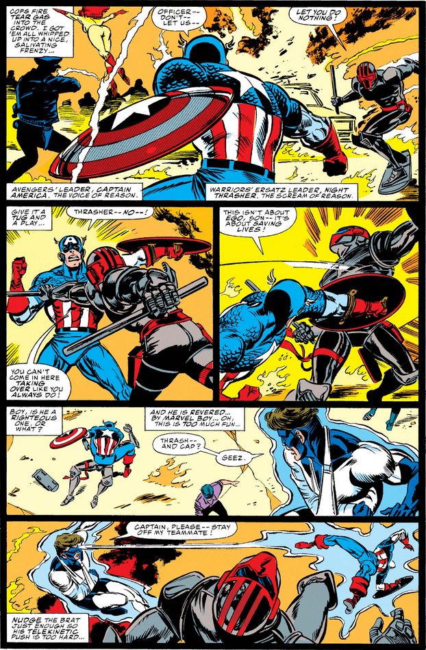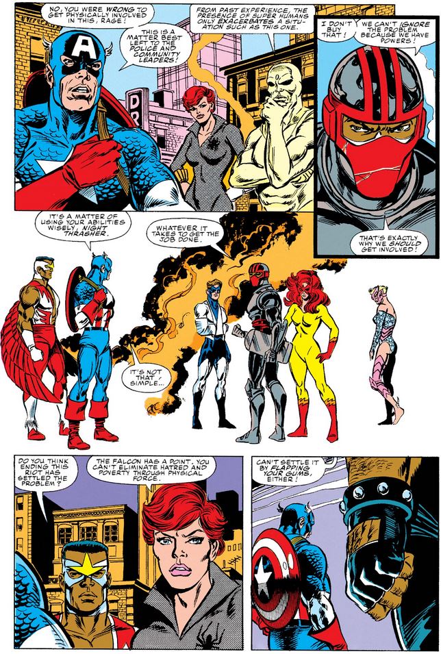 The assembled Avengers and New Warriors continue to debate the role of superheroes in addressing community unrest, with Cap and his teammates urging discretion and caution, especially if their presence could make a bad situation worse, while Night Thrasher agrees with Rage that they can’t just stand by “when things are going south.”