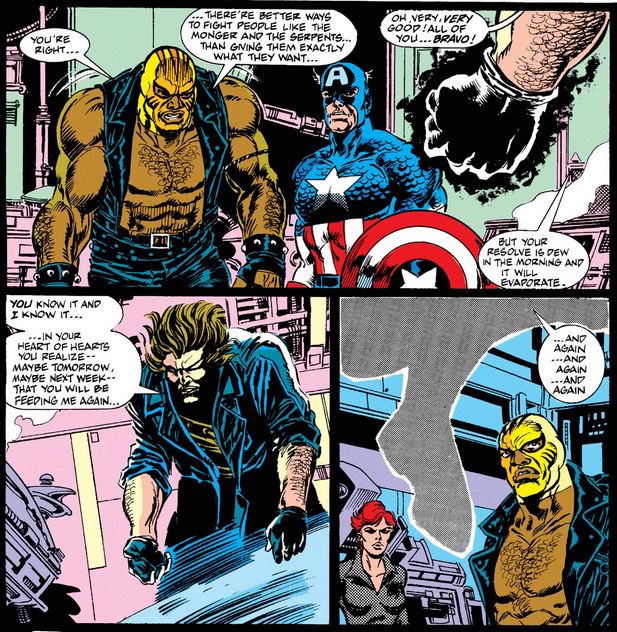 Before the Avengers can engage, the New Warriors and Rage show up; Hate Monger tries to defeat them with blasts of hate (don’t ask me how that works), but Rage has “more than enough hate of my own” to fight him with, which Hate Monger thinks make them friends. Rage disagrees, but it takes Cap’s pleas to make him realize he’s only playing into the Hate Monger’s hands.