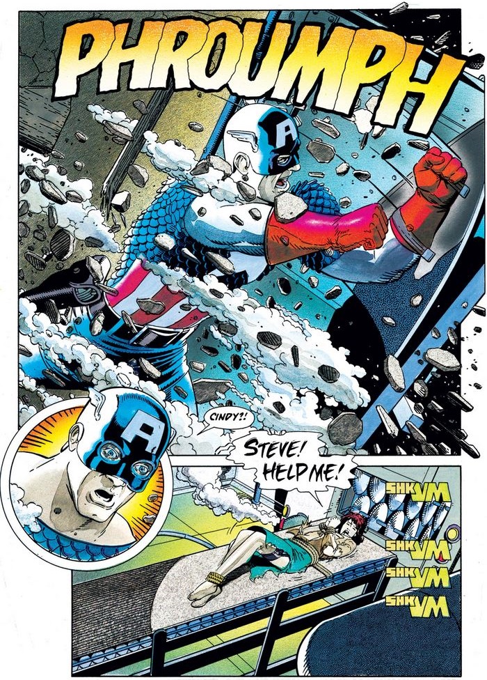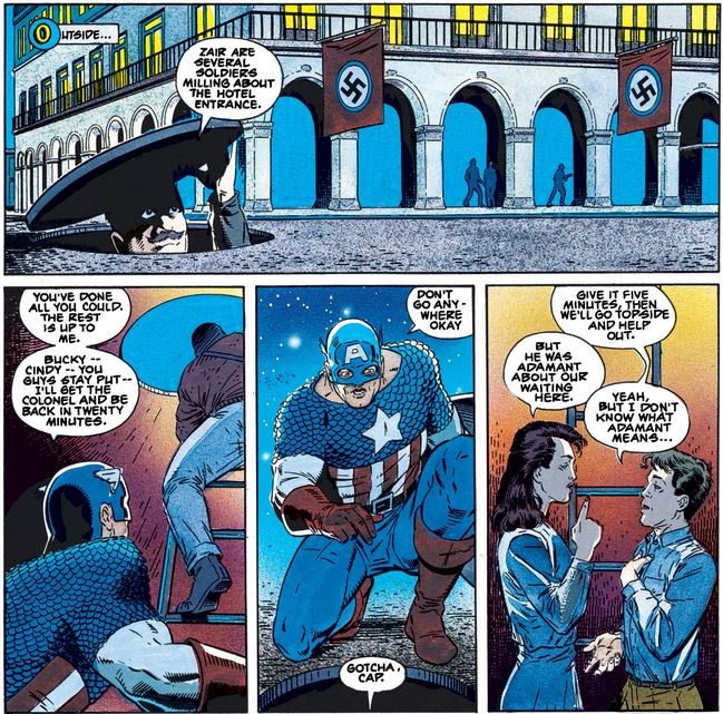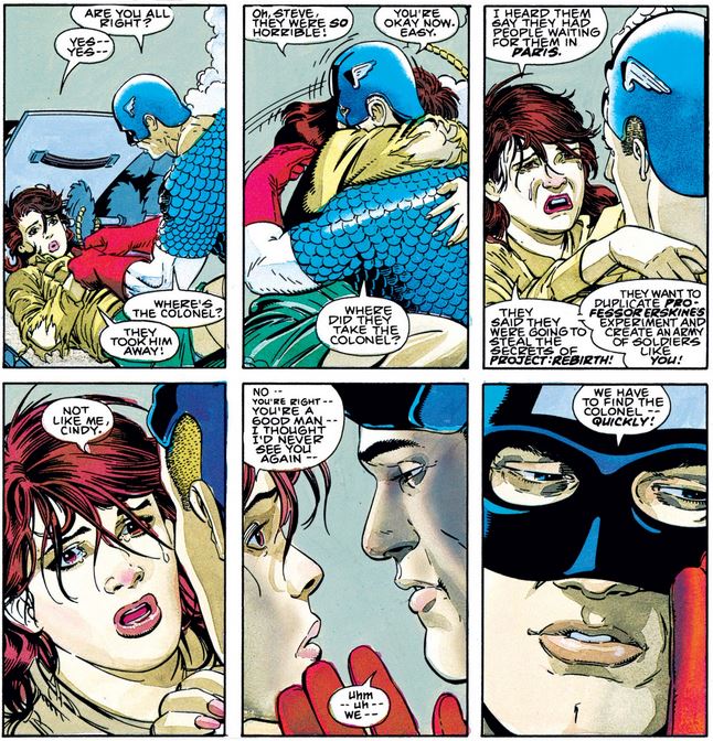 After thrusting his shield into the gears of the machine, Cap and Cindy embrace, and she tells him what the Nazis are up to… until he takes offense at an offhand comment, showing how much he values his integrity, even at this early stage in his life and career.