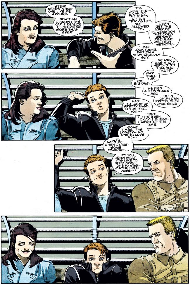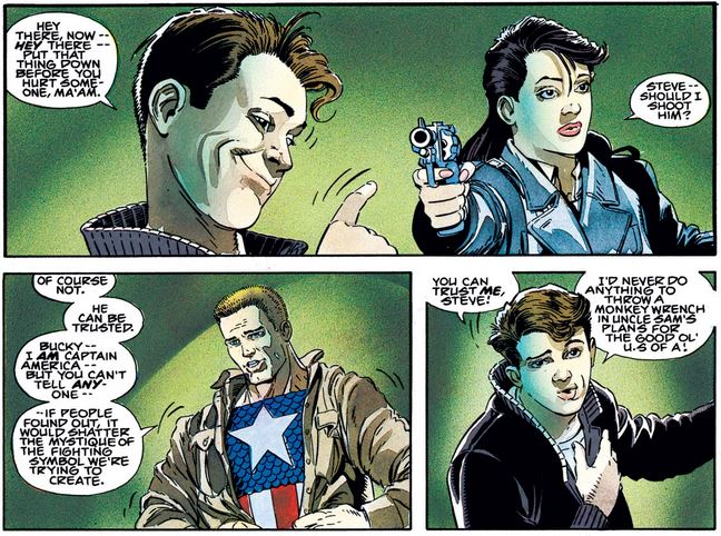 When Cindy challenges Bucky’s contribution to the mission, he hints toward his secret purpose that was made official—in a much darker fashion—during Ed Brubaker’s early-2000s run (which re-introduced him as the Winter Soldier), and even contemplates a move on Cindy before he sees Steve’s face and decides against it.