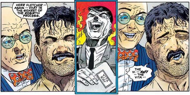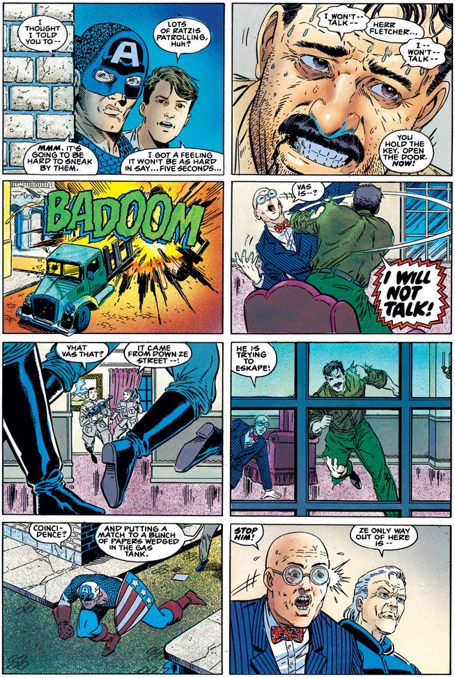Inside, the Nazis have been torturing Fletcher for information about Project Rebirth—in particular, the all-important Vita-Rays, without which even an accurately reproduced super-soldier serum produces unstable results—and then resorted to giving him truth serum, which he is doing his best to resist.