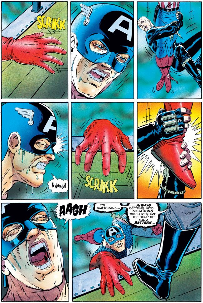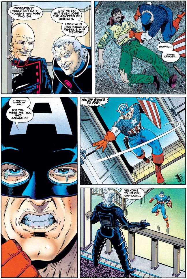 I’m sure Cap would like to know about this latest development, but he’s too busy fighting the Nazis, who have followed him up the Eiffel Tower, where one of them stabs him in the ankle with a corkscrew sticking out of the toe of his boot. Eventually they both go over the ledge…