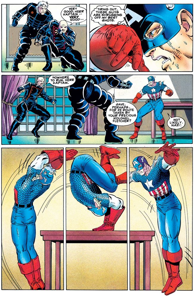 Their battle continues—two against one, I might add—and Cap starts to feel it. So, after an acrobatic flip…