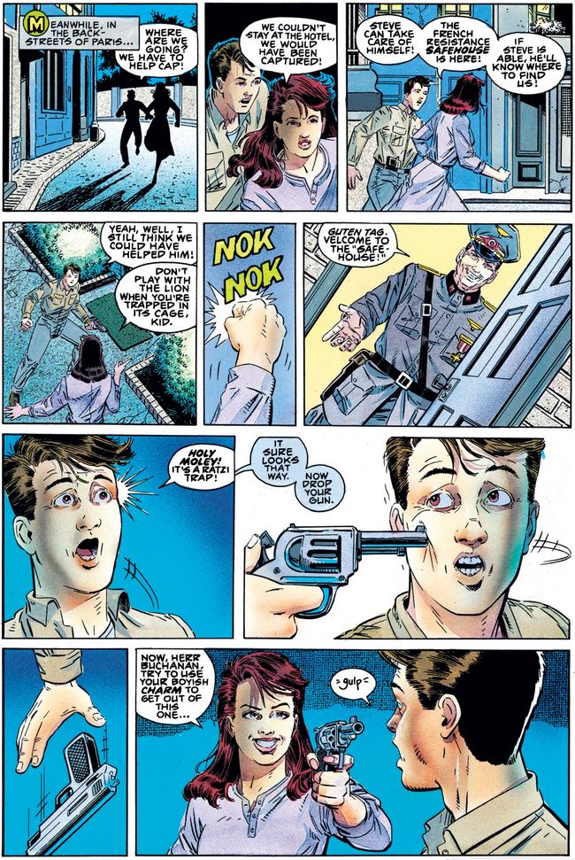 Hey, what happened to Cindy and Bucky, you ask? She takes him to the French safehouse, where he gets his second big surprise of the issue—and one that likely surprises us as well.