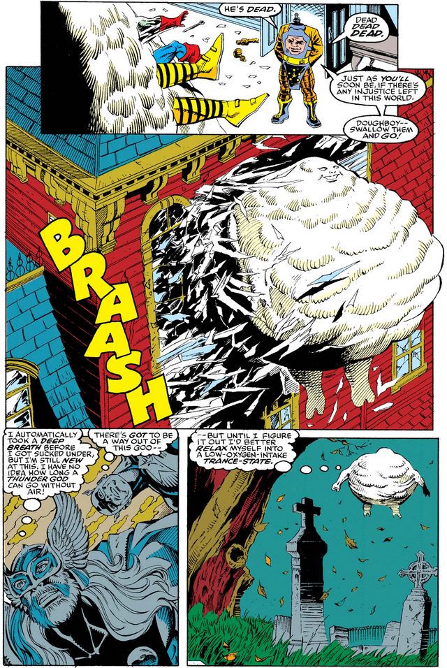 Issue #396 picks up where the last one left off, with Cap and Thor captured by Arnim Zola and his “wildest creation,” the aptly-named Doughboy.