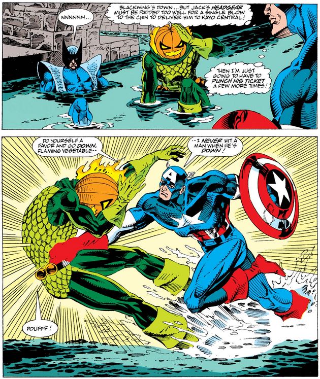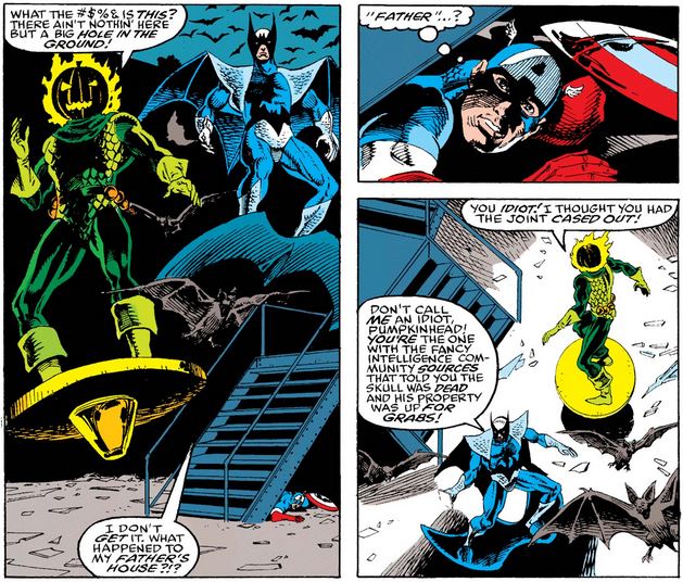 Turn out to be two C-list (at best) villains, Jack O’Lantern (not the original) and Blackwing (although you’d be excused if you thought the latter was this fella), whose father is not the Red Skull, as Cap may suspect, but the previous owner of Skullhouse (under a different name, of course).