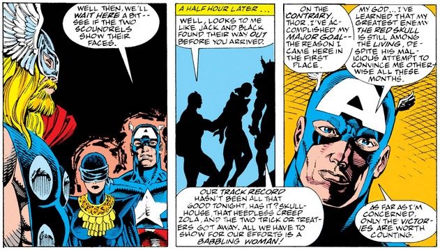 Cap naively invokes Zola’s sense of honor with that final request, which Zola grants, if disingenuously, for he and the readers know full well the Red Skull is alive. (Alive alive alive.) Plus, it’s odd to hear Zola praise “injustice”—so much for villains being the heroes of their own stories.