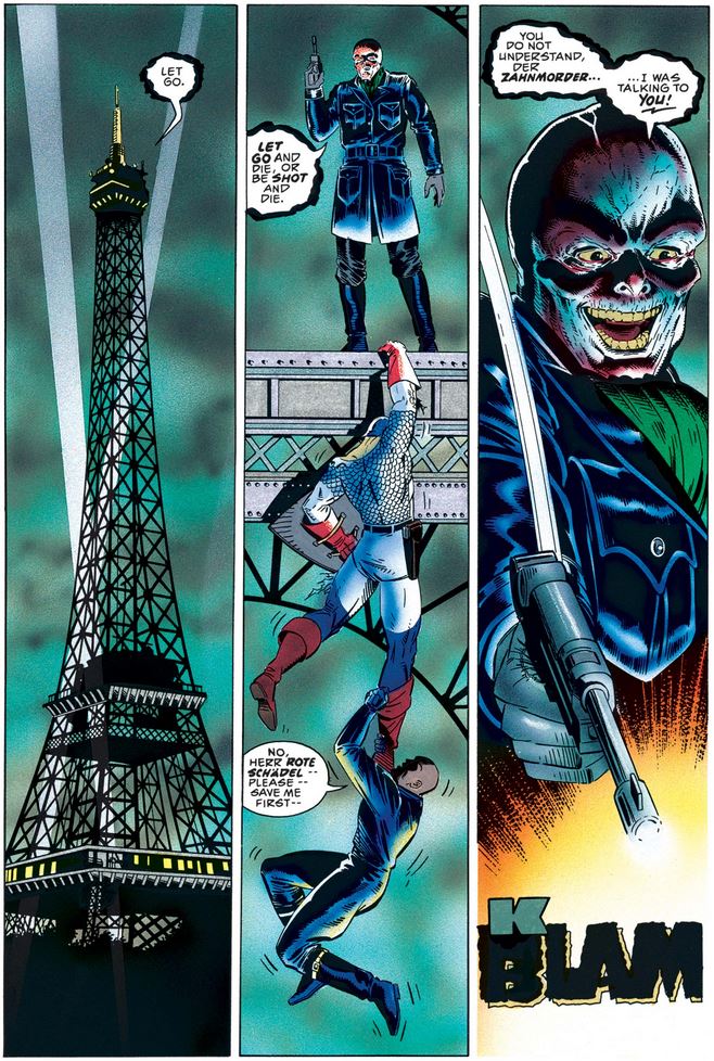 As the issue opens, Cap is just hanging out in Paris, and we learn who the gunshot at the end of the last issue was meant for…