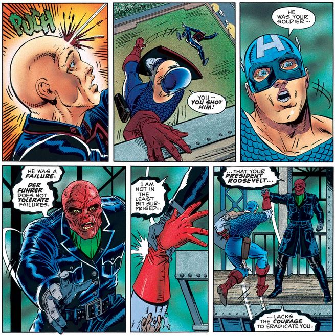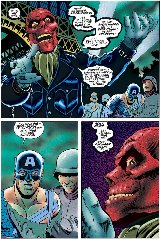Back at the main event, the Red Skull tries to draw a false parallel between himself and Cap (whom he called weak and a failure earlier, but whatever).