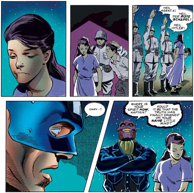This final issue of Captain America’s first miniseries shows us his first encounter with the Red Skull, as well as the fallout from the revelation about Lieutenant Cynthia Glass from the last issue, and sets the stage for Cap and Bucky’s lives going forward. (Warning: Some of the imagery in this issue may be disturbing.)
