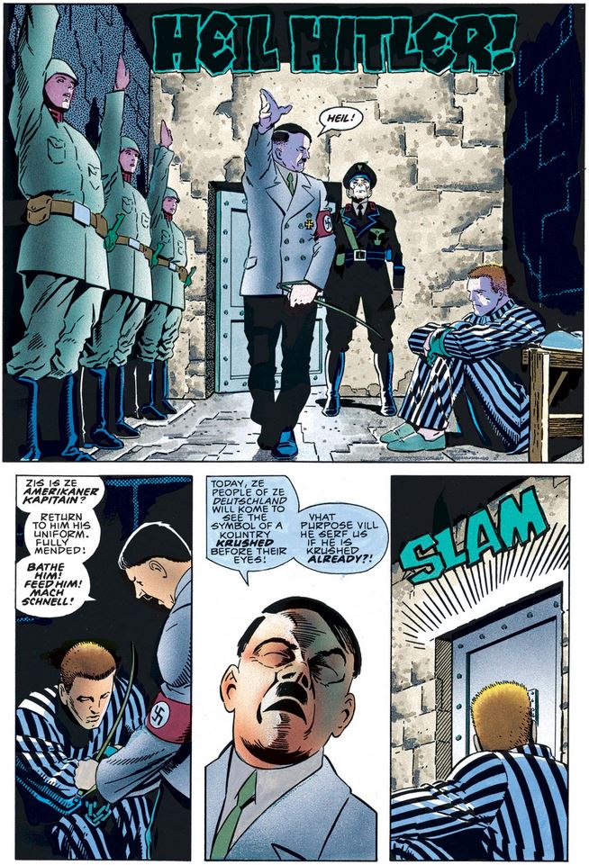 Bucky continues to snap back at the Nazi guards as they strip him and Cap, spray them down with hoses, and dress them in prison clothes, while Cap is despondent and numb, stunned by the revelation of Cindy’s treachery (and Fletcher’s murder earlier). The Führer himself notices this when he visits Cap’s cell, and orders that he be restored to prime fighting condition, at least in appearance, in preparation for a display in front of the German people.