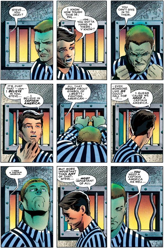 Before they can do this, however, Bucky gets a chance to talk to his friend, giving him what may be the first meaningful explanation of what Captain America means to people on a personal level, not least to Steve Rogers himself.