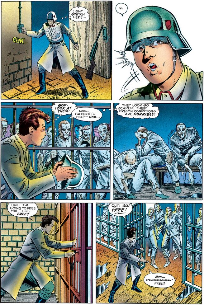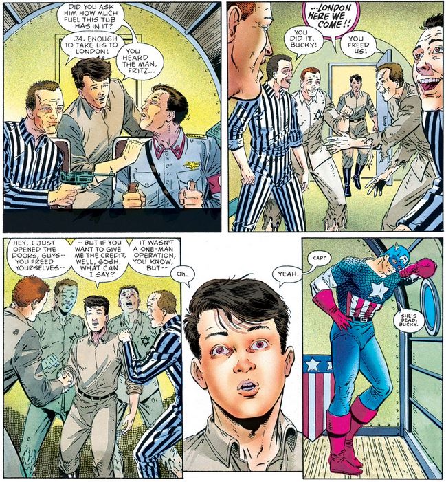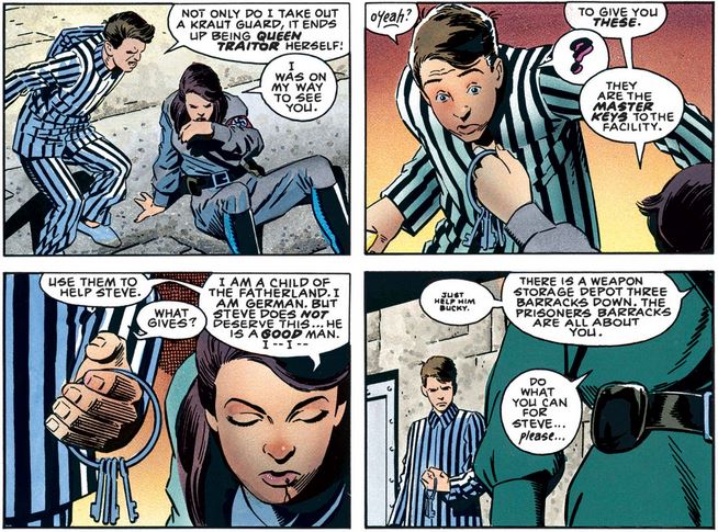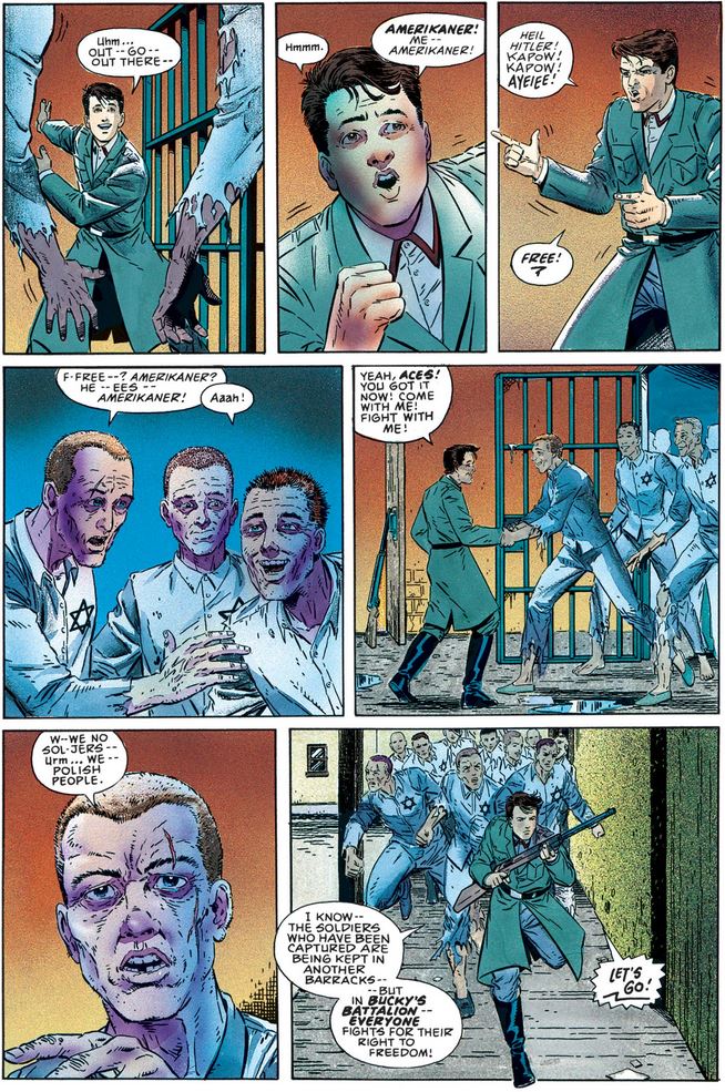 Meanwhile, Bucky has not forgotten his adopted mission: After knocking out a Nazi guard and putting on his uniform, he finds the Jewish prisoners and starts to free them (after being shocked, once again, on the inhumane conditions of their captivity).