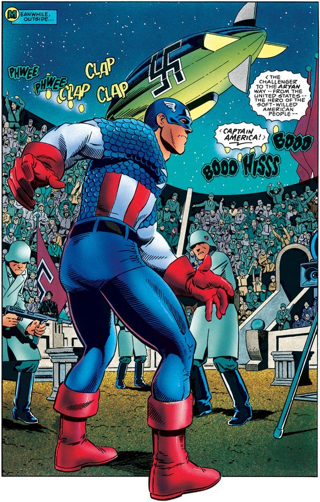 As Cap gains the upper hand in the battle, various segments of the viewing audience react very differently, and Cap takes the chance to show his inspirational lines are much better than the Skull’s.