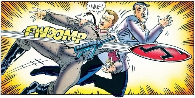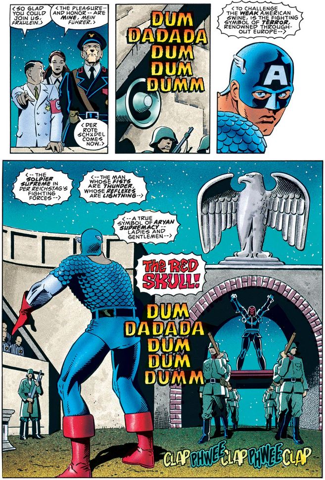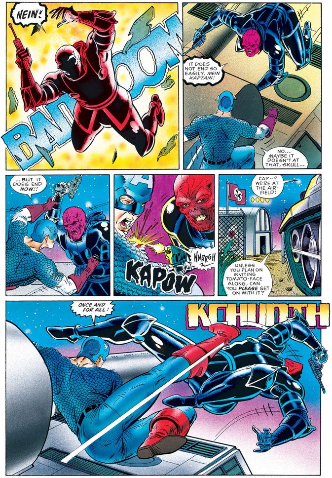 The Red Skull begins with typical fascist ranting about being superior and the Nazis’ success being a historical inevitability before attacking our hero personally. Naturally, Cap does not give in…