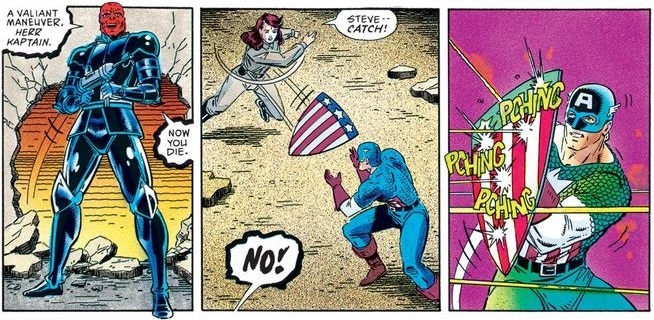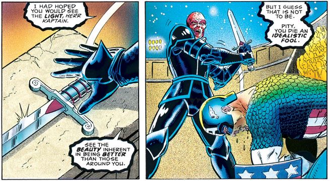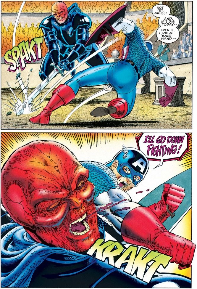 After they fight more, and Cap still refuses to concede to his opponent’s claims of their mutual supremacy, the Skull prepares to deliver the killing blow…