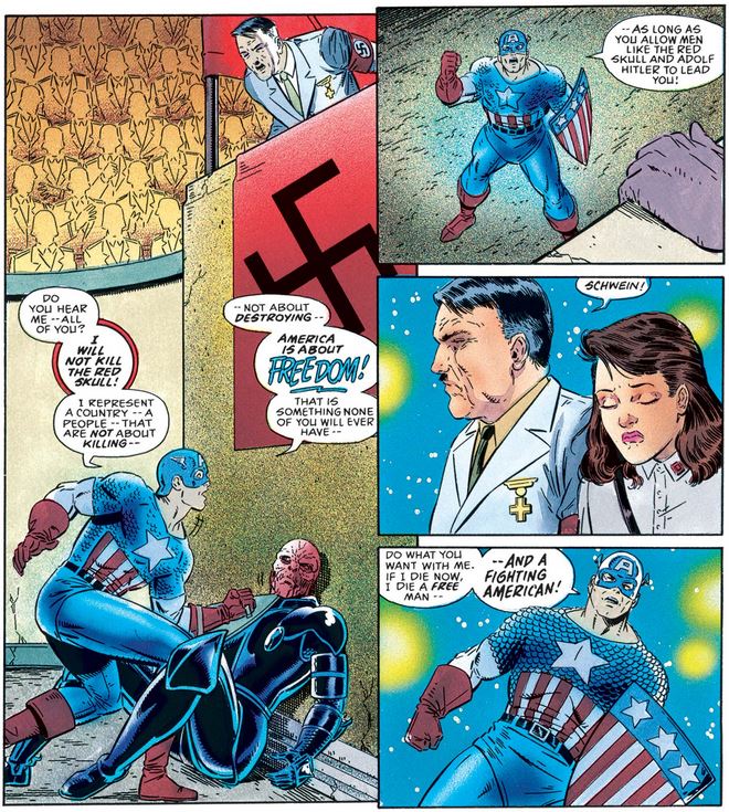 He then turns his attention to the crowd (and the small man overhead), making clear that he won’t take the step the Skull tried to and explaining that it’s not consistent with the ideals of the country he represents, ideals he’s willing to die for.