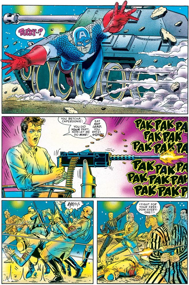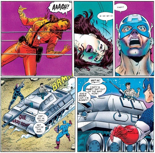 Note that Bucky does not share Cap’s antipathy toward killing, which again foreshadows his later character development in the mid-2000s.
