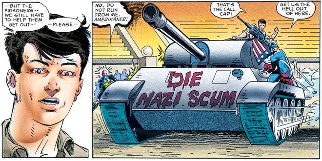 But before anyone can respond, a tank with “DIE NAZI SCUM” painted across the front bursts through the stadium accompanied by a wild howl, and Cap easily guesses who’s behind the wheel.
