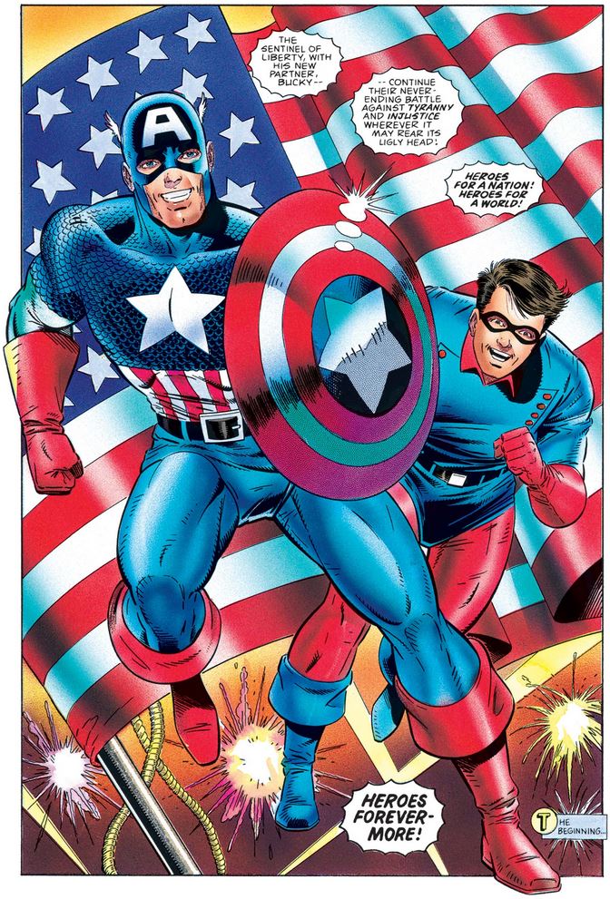 After Pat and Eliot, Steve Roger’s roommates from the first issue, watch a newsreel of Cap and Bucky’s successful landing in America (after a stop in London to drop off the freed prisoners), the final page shows Cap in his classic outfit, the famous round shield in his hand, and Bucky beside him in his red-and-blues, ready for more adventures.