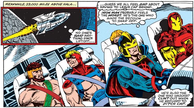 Meanwhile, his teammates are flying away from the planet, albeit still conflicted about leaving their missing leader behind, with the Black Knight imagining that even Tony feels bad about it. (I mean, look at the anguish on his “face”!)
