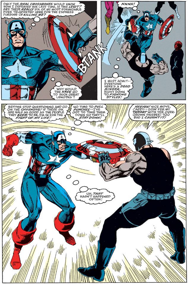 Let’s get back to Cap: After he comes to and remembers being taken to the Kree Supreme Intelligence’s chamber before the “explosion,” he is jumped from behind…