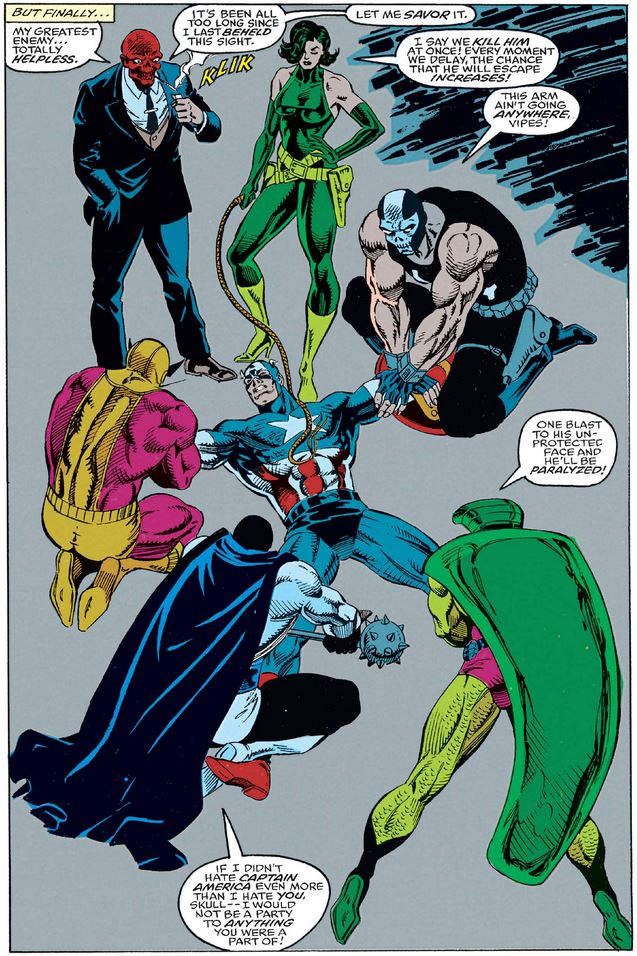 Eventually, the six villains get the best of Cap, but can’t stop bickering among themselves (often the downfall of evil collectives).