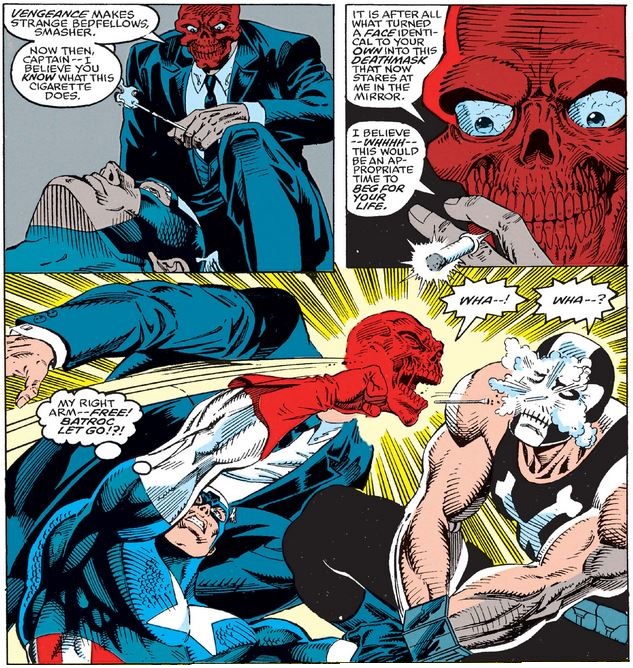 The trio becomes a sextet with the appearance of Viper, Crossbones, and the Red Skull himself, to which Cap responds with “this all you got?”