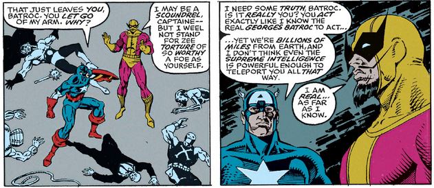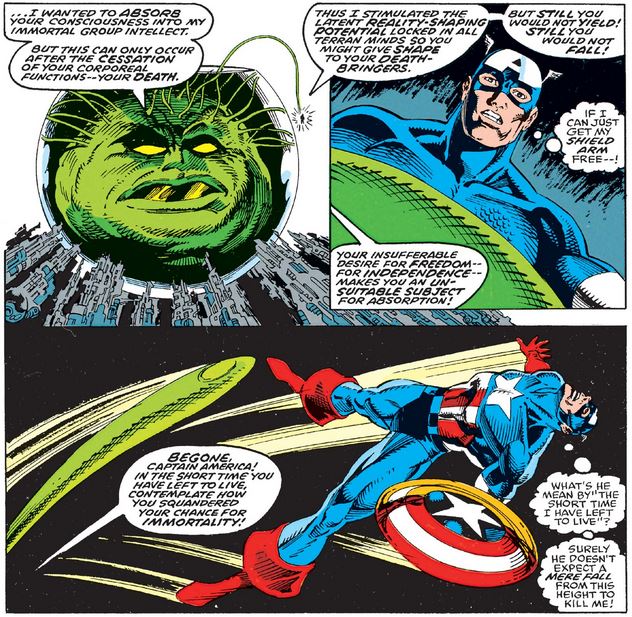 …becoming part of the Supreme Intelligence itself. But not only did Cap not fail and die, he demonstrated resilience and individuality that are not well suited for assimilation—I mean, absorption. (Eww.)