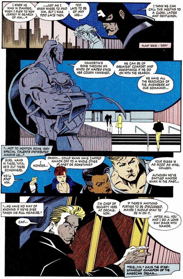 Meanwhile, Namor is missing, and in Namor the Sub-Mariner #26, Cap is part of the group looking for him, which includes Jim Hammond, Danny Rand, Misty Knight, Colleen Wing, and Namorita, who assures the rest her cousin is still alive.