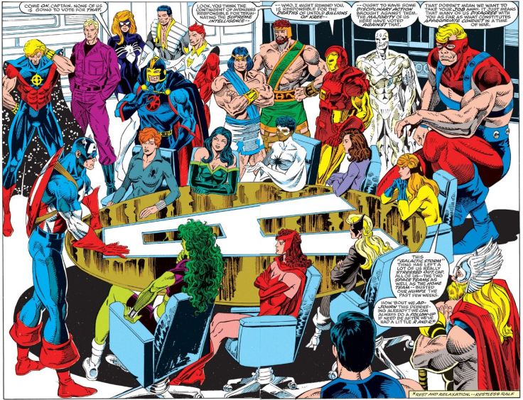 I agree completely with Cap on one aspect: the Avengers definitely should have put the Supreme Intelligence on trial for war crimes. Attempting to execute the SI right on the spot was a huge mistake. At the time the SI was not an immediate threat,and it severely undermined the Avengers’ credibility & moral standing at a key moment. The attempt to kill the SI enabled it to fake its own death and go into hiding, during which it *did* once again become a major threat. This also prevented the truth of the SI being the one who started the Kree-Shi’ar War and detonated the Nega Bomb from becoming public, and as a result it was easy for the Kree survivors to be manipulated into believing the Earth was responsible for the destruction of their empire, which in turn led to several devastating terrorist attacks against humanity. So, yeah, it was a *really* bad decision.
