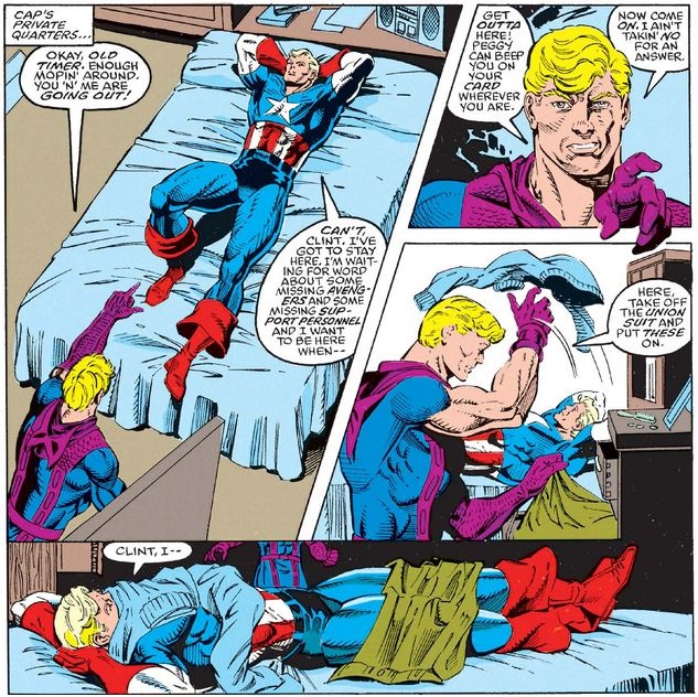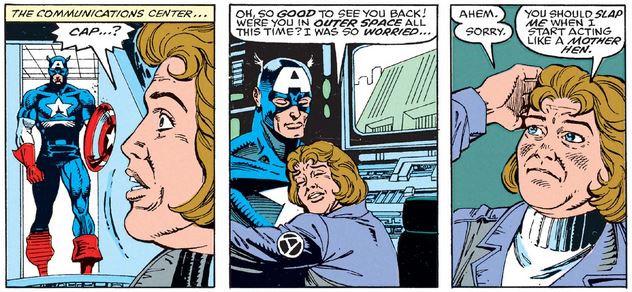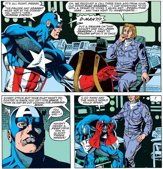 Without signalling whether he appreciated Peggy’s concern, Cap gets right down to business, following up on the two back-up stories from the last issue. (Really can’t blame him, because we didn’t even cover them in our post!) Peggy doesn’t know yet that Falcon and USAgent discovered D-Man alive, so as far as Cap is concerned, it’s all just bad news, and he becomes even more despondent.