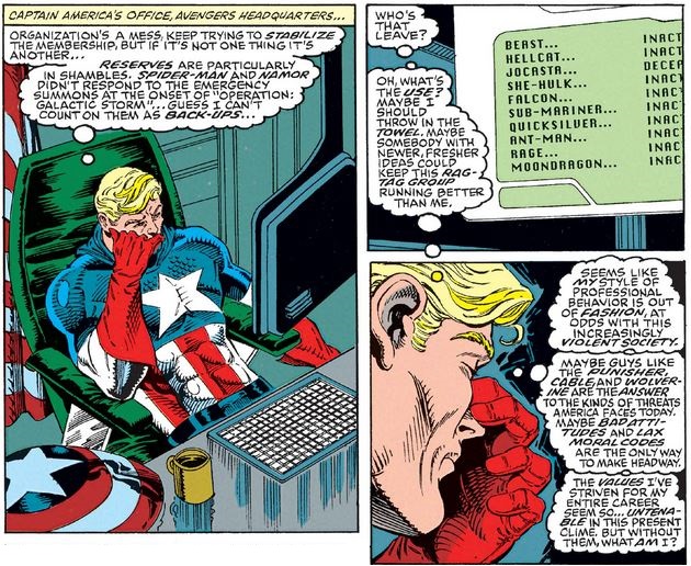 And things do not look better once he refocuses on Avengers matters, as his thoughts turn to his “old-fashioned” moral code and whether it is relevant in the modern world, which celebrates heroes willing to cross traditional lines of ethics to “get the job done.”