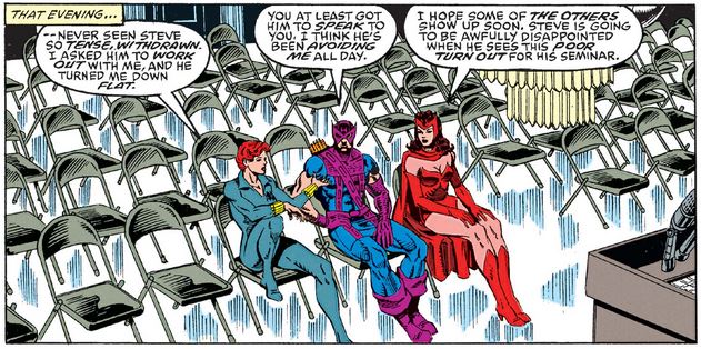 Below we see that a lot of Avengers apparently took Cap’s answer to Thor’s question to heart, which only makes the three who do show up to Cap’s seminar even more worried about him. (I mean, he turned down a workout session!)